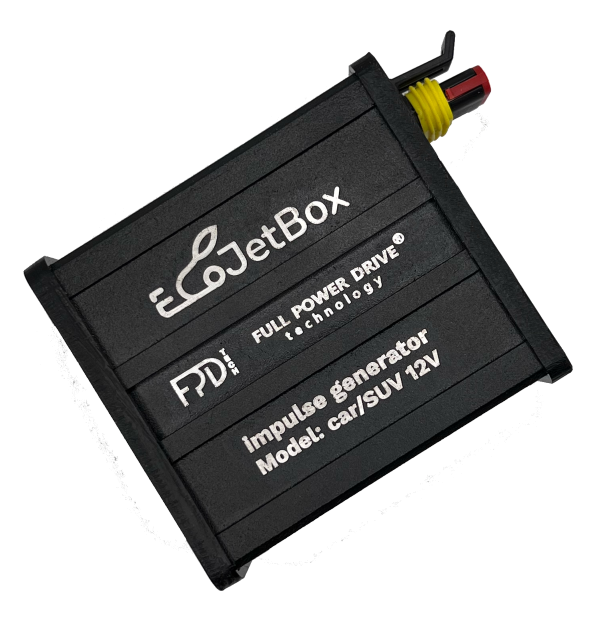 Ecojetbox is an impulse generator. It is as small as a human fist. It is connected to a vehicle’s electric system so it works on the electric energy of the vehicle and immediately sends back its own electrical impulses to the vehicle’s system that reduces the resistance of the electric generator by eliminating the electromotive force of self-induction within the electric generator. This way the motor of the vehicle spends less efforts to rotate the generator and the saved mechanical energy is used to run the transmission. That is the "magic" of our invention! Ecojetbox impulse generator can be connected easily to the interior cigarette lighter socket and to the fuse box "under the hood".